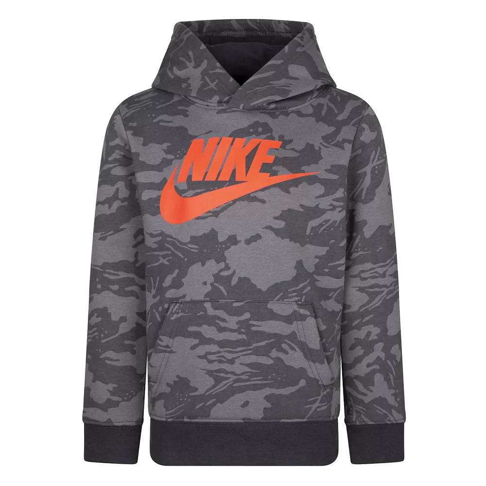 Keep him cozy and camouflaged in this warm boys’ Nike Club camo fleece pullover hoodie.
