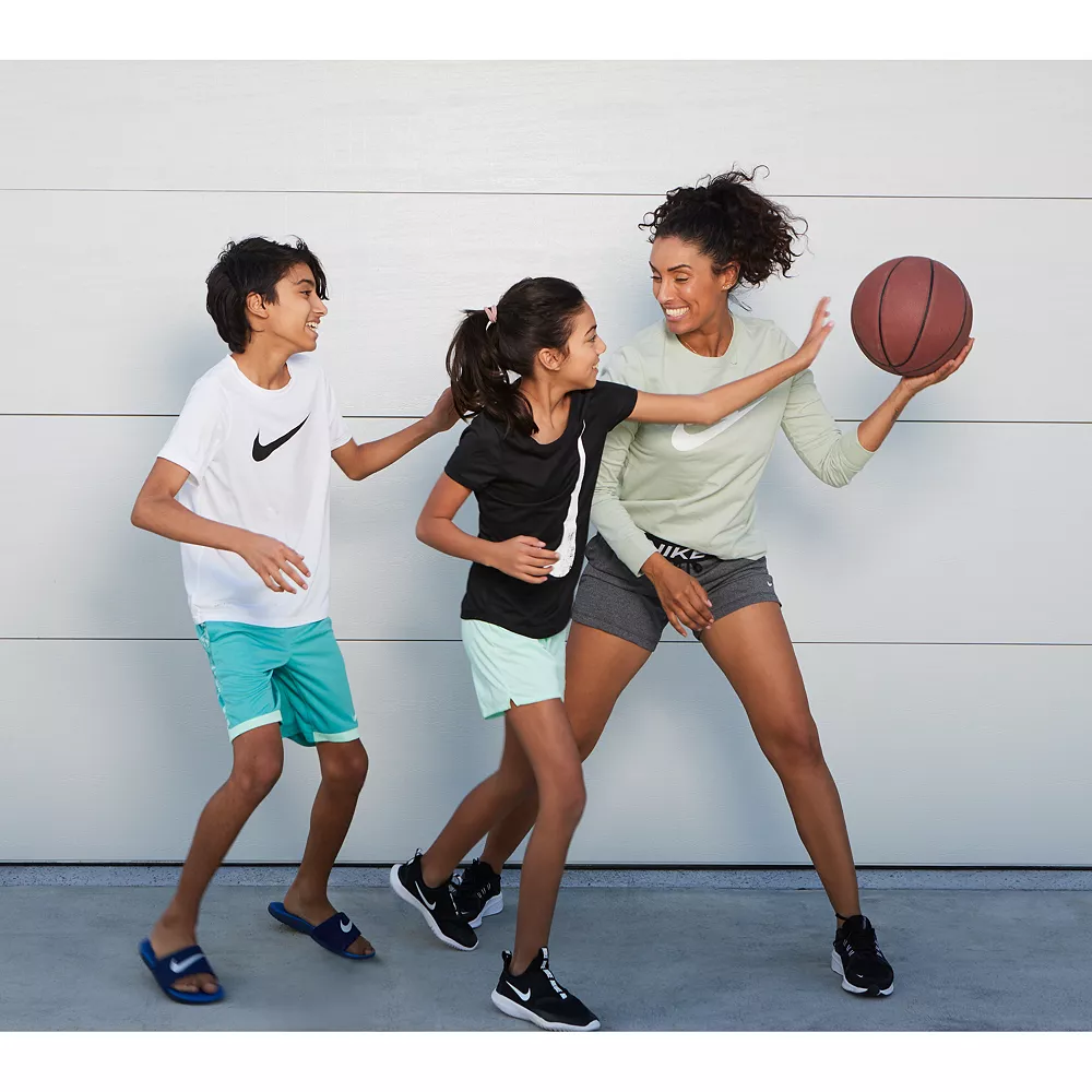This Nike girls’ tee goes big with a glossy Swoosh logo on a comfy fabric she can rock any day of the week.