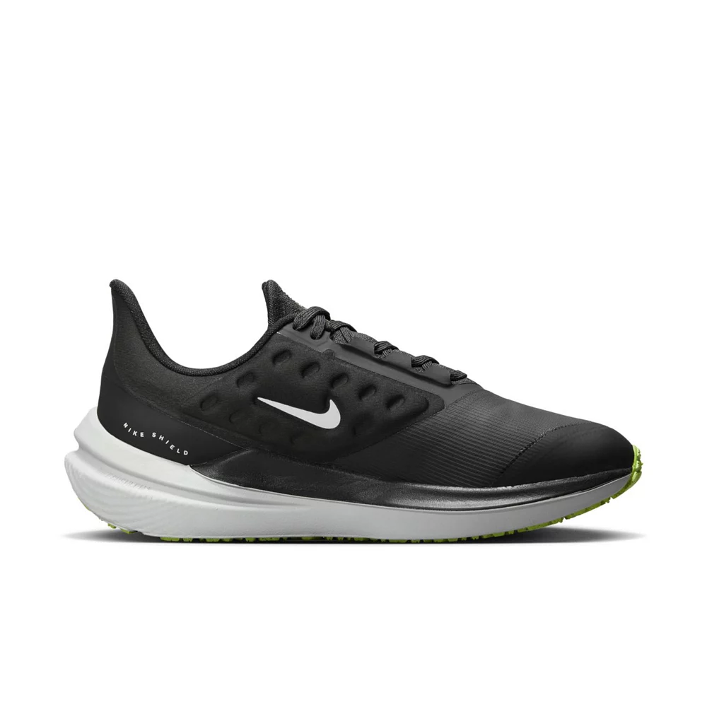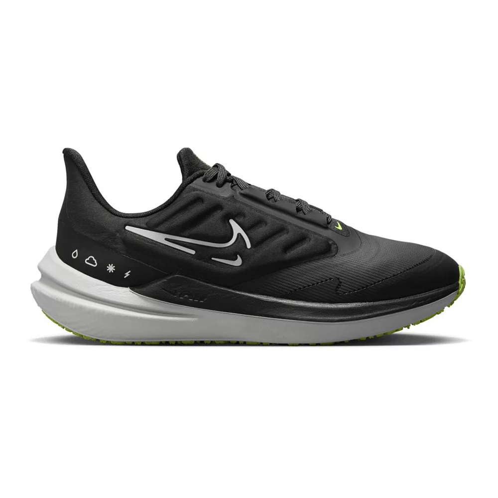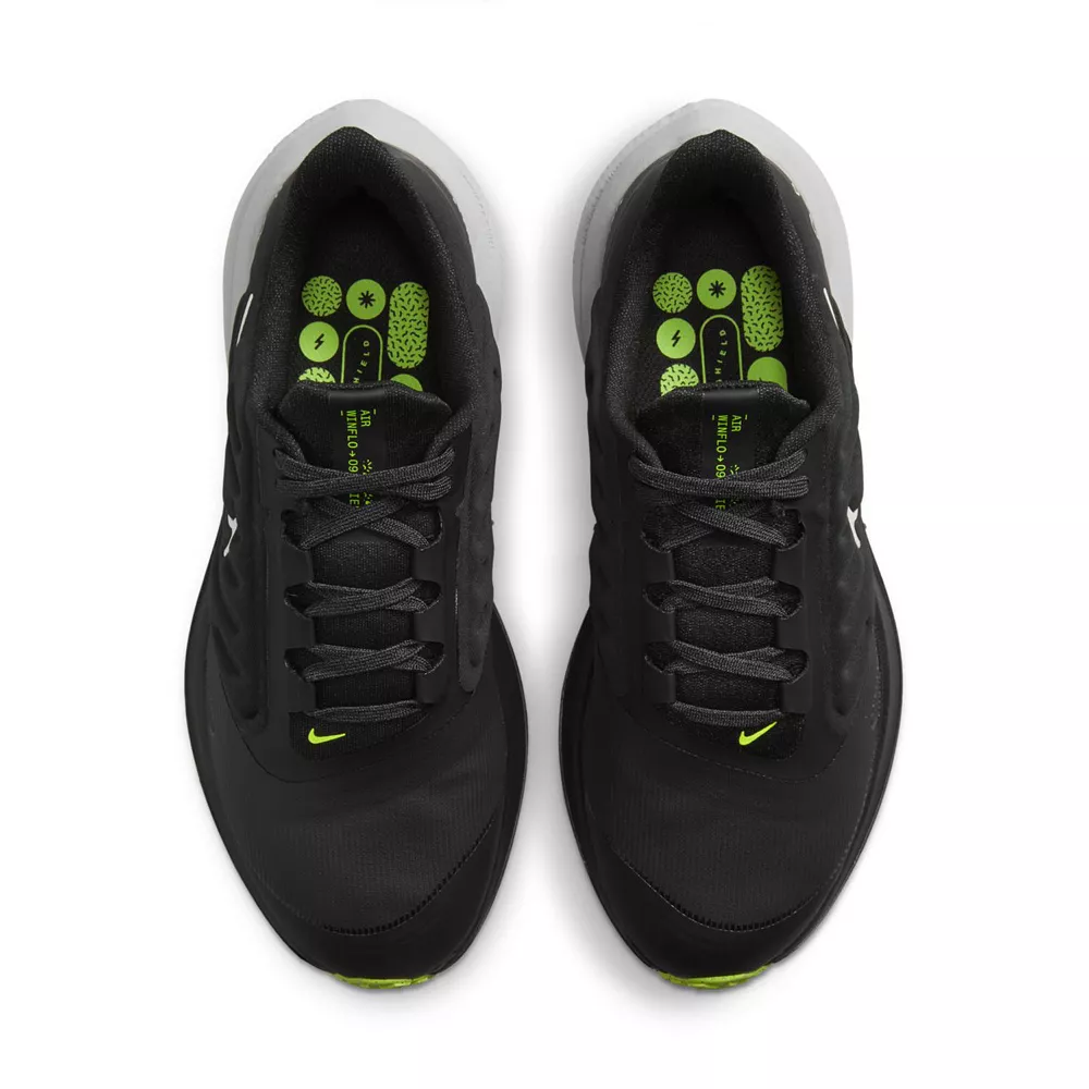 Nasty weather doesn’t need to put an end to your day. Go out and revel in the elements, because the designof this women’s Nike road-running shoe will be there through every puddle, pitstop, pothole and personal record. It’s water repellent and boasts all-terrain tire-like traction and a storm-tread outsole for downpours, first, but with a cozy fleece feel on the inside, thanks to an unbeatable duo of Heathered lining and structured insulation inspired by our Aeroloft technology.