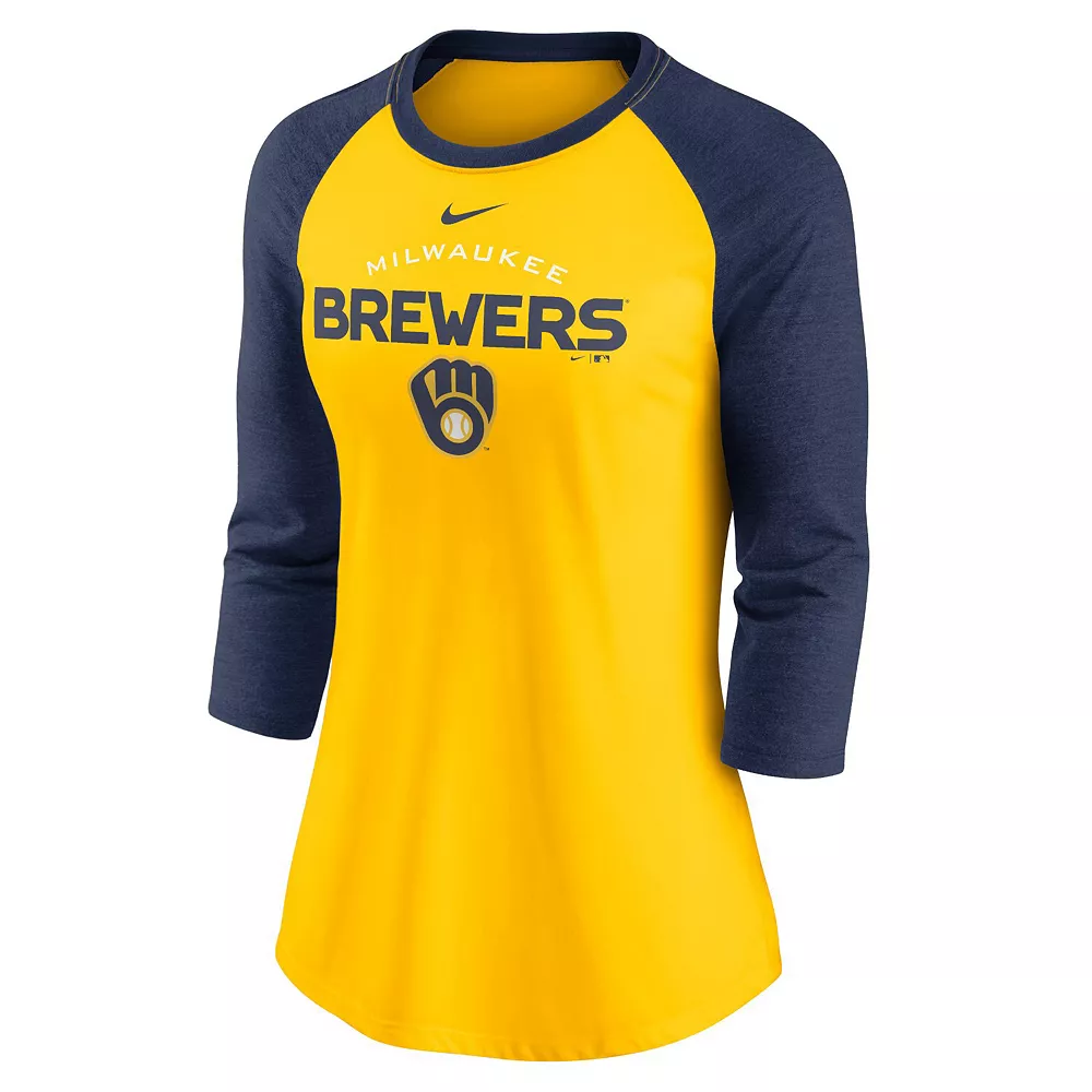 Let your fandom shine this season in true Milwaukee Brewers style with this Modern Baseball Arch T-Shirt from Nike. Along with roomy raglan sleeves for optimal arm movement, this tee offers a droptail hem for extra coverage. Best of all, the vibrant colorway and spirited Milwaukee Brewers graphics on the chest let you show off your devotion to the squad.